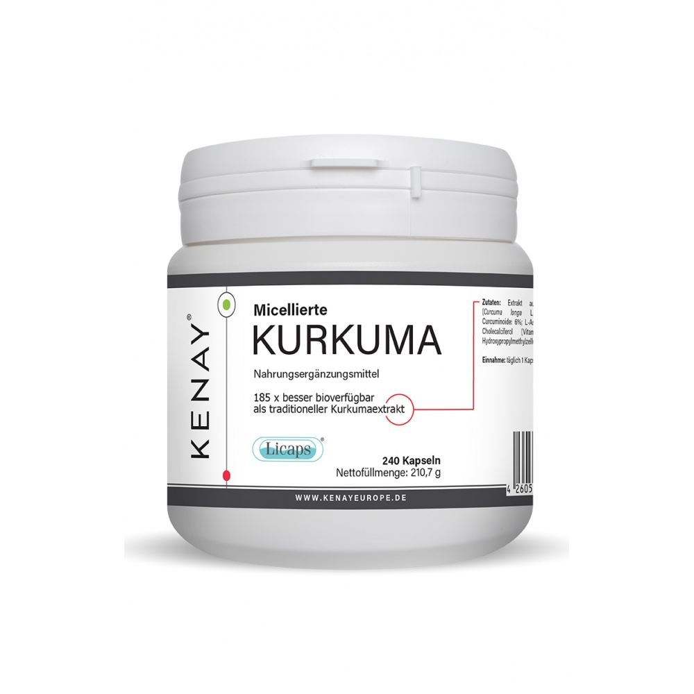 Zutaten: Extrakt aus Kurkumawurzelstock (Curcuma longa L.) standardisiert auf Curcuminoide: 6%; L-Ascorbinsäure (Vitamin C); Cholecalciferol (Vitamin D); Kapselhülle: Hydroxypropylmethylzellulose.